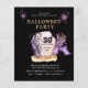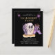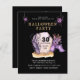Este convite de Orçamento Maligno Assustador para uma festa de Halloween com um morcego engraçado roxo, uma lápide e aranhas roxas em um fundo preto. No verso, também há um morcego com uma lápide e galhos de floresta em tons laranja e roxo. Personalize-o e aproveite.