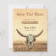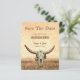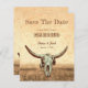 Orçamento do país ocidental Vintage beige castanho antigo estilo de vaqueiro. Casamento divertido, salve as cartas chatas. Convites de crânio de vaca em touro. Usa um pouco de humor com esta design de fazenda engraçada e engraçada. A tipografia pode ser personalizada. Velho oeste selvagem, único. animal legal, de moda fazenda. Personalizar script e tipografia. Imagem copyright Marg Seregelyi Fotografia.