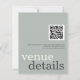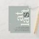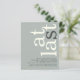 Um valor para o alternativo do ORÇAMENTO em tamanho menor de 4,5 x 5,6" de semirbrilho de 110 lbs, que é de espessura semelhante a um cartão postal (no entanto, não é adequado para uso como cartão postal). POR FAVOR, OBSERVE QUE HÁ UM convite por folha. No Último Código QR, Anúncio e Convite para Festa de noivado de Texto de Fatura. Um design tipográfico moderno, com Finalmente em grande tipografia girada e à direita no topo, em marfim com cinza para a letra "s" num fundo de verde macio. A cor do plano de fundo pode ser alterada em cada lado se você desejar por meio de Personalizar mais. Esta versão do convite é destinada às partes em mente que se realizam em um hotel ou restaurante (ou qualquer local com um site), substituem o código QR no verso por um código QR no seu website para tornar conveniente que os convidados encontrem instruções, etc. Você pode criar códigos QR gratuitamente on-line. Procure "Criador de código QR" e muitas opções surgem para criar gratuitamente. Você também pode excluir o código QR e o texto na parte traseira, se não for necessário por meio de personalização adicional.