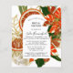 Lindas flores vermelhas da poinsettia e fatias laranja de citrinos aninhadas em folhas verdes escuras. Perfeito para o casamento no inverno de dezembro. Este elemento faz parte da coleção Poinsettia e Chás de panela Citrus.