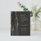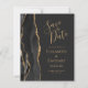 A borda esquerda deste elegante casamento moderno salve o cartão de data apresenta uma borda de agata preta aparada com falso brilho dourado. O texto personalizável combina manuscrito dourado, fontes em copperplate e itálico em um fundo fora de preto. O verso apresenta um design de agate preto e dourado correspondente.