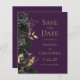 Este elegante casamento moderno salve o cartão de data com uma borda de flores pretas e folhas de folhas falsas douradas. Personalize o texto dourado em um fundo roxo escuro. A parte traseira da placa é roxa sólida.