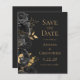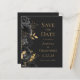Este elegante casamento moderno salve o cartão de data com uma borda de flores pretas e folhas de folhas falsas douradas. Personalize o texto dourado em um fundo preto de ardósia escura. A parte traseira da placa é preta com ardência sólida.