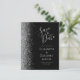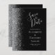 A borda esquerda deste elegante cartão de salve a data de casamento moderno apresenta uma borda de brilho prateado falso. O texto personalizável combina caligrafia cinza prateada, cobrejato e fontes itálicas em um fundo preto. O verso apresenta um design preto e prata correspondente.