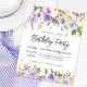 Honra uma mulher especial com este convite de aniversário elegante e feminino. Os detalhes da comemoração de aniversário estão cercados por cima e por baixo, bordas florais roxas. Os elementos florais estão aninhados em folhas verdes profundas. Enquanto é um design tradicional, a folhagem botânica aberta e arejada e o texto lhe dão uma vibração contemporânea. Este item faz parte da coleção Botânica Floral Roxo Rústica.