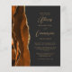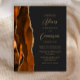 A borda esquerda deste elegante convite de casamento moderno apresenta uma cor de água laranja queimada, aparada com falsa brilho dourado. O texto personalizável combina o script dourado e as fontes sans serif em um fundo preto de slate. O verso apresenta uma design de cor laranja queimada e dourada.