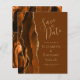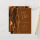 A borda esquerda deste elegante casamento moderno salve o cartão de data apresenta uma borda agitada de cor laranja queimada, aparada com falsa brilho dourado. O texto personalizável combina manuscritos dourados, copperplate e fontes itálicas em um fundo marrom noz. O verso apresenta uma design de cor laranja queimada e dourada.