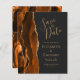 A borda esquerda deste elegante casamento moderno salve o cartão de data apresenta uma borda agitada de cor laranja queimada, aparada com falsa brilho dourado. O texto personalizável combina manuscrito dourado, fontes em copperplate e itálico em um fundo preto de ardósia escura. O verso apresenta uma design de cor laranja queimada e dourada.