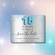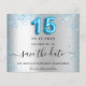Uma garota e moda Salve o cartão de data para uma Quinceañera, 15 festa de aniversário. Um fundo com aspecto fino prateado decorado com poeira brilhante azul. Personalize e adicione uma data e nome/idade. O texto: Salvar a Data é gravado com um script de estilo com letra de tendência grande. Número 15 com uma fonte no estilo do balão.