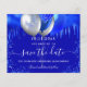 Um fundo azul real da moda decorado com pingos azuis reais, confete e balões. Personalize e adicione uma data e nome/idade. O texto: Salvar a Data é gravado com um script de estilo com letra de tendência grande.