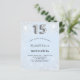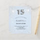 Um convite moderno, elegante e glamoroso para a Quinceañera de uma menina, festa de 15 anos. Um fundo azul bebê, decorado com purpurina prateada falsa. Personalize e adicione seu nome e detalhes da festa. O número 15 é escrito com uma fonte estilo balão, manuscrita.