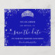 Uma garota e moda Salve o cartão de data para uma Quinceañera, 15 festa de aniversário. Um fundo azul real colorido. Decorado com pó falso prateado e uma tiara, coroa. O texto: Salvar a Data é gravado com um script de estilo com letra de tendência grande.