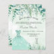 Um convite de tendência para uma Quinceañera, festa de aniversário 15, tema de floresta encantado. Um fundo de cor aquosa verde com samambaias e eucalipto verde, um vestido verde. O nome é escrito com um moderno estilo escrito à mão. Personalize e adicione os detalhes da sua festa.