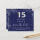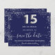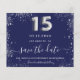 Uma tendência Salve a data para uma Quinceañera, 15 festa de aniversário. Um fundo azul marinho decorado com pó falso de cinza prateada. Personalize e adicione uma data e nome/idade. O texto: Salvar a Data é gravado com um script de estilo com letra de tendência grande. Número 15 com uma fonte no estilo do balão prateado.