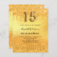 Um convite moderno, na moda e glamouroso para uma Quinceañera, festa de aniversário 15. Um fundo metálico de ouro falso com pingos de brilho falso, aparência de pingar tinta. O nome é escrito com um moderno estilo escrito à mão. Personalize e adicione os detalhes da sua festa. O número 15 é escrito com uma fonte de estilo balão, script.