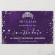 Uma garota e moda Salve o cartão de data para uma Quinceañera, 15 festa de aniversário. Um fundo púrpura incolor. Decorado com pó falso prateado e uma tiara, coroa. O texto: Salvar a Data é gravado com um script de estilo com letra de tendência grande.