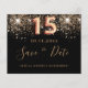Uma garota e uma moda Salvem a data para uma Quinceañera, 15 festa de aniversário. Um fundo preto decorado com falso brilho dourado. Modelos de uma data, nome e texto. Letras coloridas com ouro. O texto: Salvar a Data é gravado com um script de estilo com letra de tendência grande.
