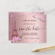Um cartão Salve a Data para uma Quinceañera temática de Paróquia, festa de 15 anos. Um fundo metálico rosa bege decorado com a torre Eiffel, flores e corações rosa. Personalize e adicione uma data e nome/idade. O texto: Salve a Data é escrito com um estilo de letra manuscrita trendy com floreios.