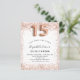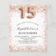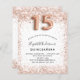 Para uma elegante Quinceañera, 15. Um fundo branco. Decorado com rosa dourado, cintilação falsa rosa, faíscas. Personalize e adicione um nome e detalhes da festa. O nome é escrito com um script de estilo manuscrito, número 15 com fontes de estilo de balão.
