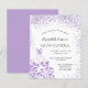 Um convite moderno, na moda e glamouroso para uma Quinceañera, festa de aniversário 15. Na frente: Um fundo branco com violeta, brilhos lilás, um vestido violeta. O nome é escrito com um moderno estilo escrito à mão. Personalize e adicione os detalhes da sua festa.