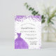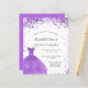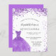 Um convite moderno, na moda e glamouroso para uma Quinceañera, festa de aniversário 15. Na frente: Um fundo branco com violeta, brilhos lilás, um vestido violeta. O nome é escrito com um moderno estilo escrito à mão. Personalize e adicione os detalhes da sua festa.