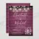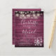 Um convite de casamento para na moda rustic em orçamento com bonito luzes de cordas, frascos-pedras, nomes de estilo de assinatura e tipografia quic em um fundo vermelho de madeira rusticado. Projetado por Thisnotme©