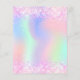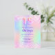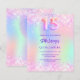 Um convite de festas de Quinceañera feminino e feminino. Na frente: Um arco-íris, fundo holográfico colorido em roxo, rosa, verde-menta. Decorado com confete cor-de-rosa penteado. Personalize e adicione um nome e detalhes da parte. O nome é escrito com um script de estilo manuscrito, letras cor roxa. 1 folha = 1 convite impresso de borda a borda.