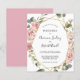 As rosas rosadas empoeiradas empoeiradas estão aninhadas em folhagem verde-escura. Eles formam um quadro floral em torno de seus detalhes de casamento. Este convite para o casamento faz parte da coleção de Casamentos Dusty Pink Rose