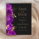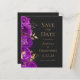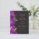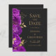 Este elegante casamento moderno salve o cartão de data com uma borda de flores roxas e folhas de folhas falsas douradas. Personalize o texto dourado em um fundo preto de ardósia escura. A parte traseira da placa é preta com ardência sólida.