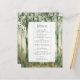 Este cardápio de casamento apresenta um fundo paisagístico de cor d'água rústica em tons de verde e ouro. O texto personalizável das cinzas de carvão cardíaco é exibido em uma tela branca retangular. A cena da floresta é repetida no verso da carta.
