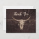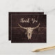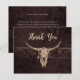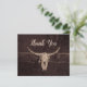 Este cartões de agradecimentos plano apresenta uma textura marrom rústica, crânio de vaca, rodeio do país ocidental, tema do casamento do cowboy rodeo. Farmhouse style, antiga antiga antiguidade selvagem ocidental. design de animais legal, modernos, modernos e de fazenda. Imagem copyright Marg Seregelyi Fotografia.