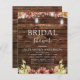 Orçamento Rústico País Exteriores em Madeira Escura com Girassóis Burgundy, Laranja e Amarelo em Potes de Pedra com Luzes de Corda Convites de Chá de Noiva de Outono ou Queda de Casamento - inclui uma bela e elegante tipografia de roteiro para a celebração especial da Noiva