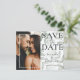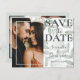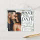 Elegante, salvar o anúncio de data é perfeito para pôr em marcha seus planos de casamento. Apresenta um modelo fotográfico e uma grande tipografia 'salvar a data' com a adição de folhagem delicada e macia, tudo sobre fundo branco. Personalize com seus próprios detalhes.