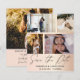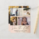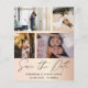 Elegante salve nosso anúncio de data. Este modelo rosa dourado apresenta espaço para 4 das suas fotografias de casais favoritas em branco com caligrafia legal escrita à mão em cinzas escuras. Fácil de editar com seus próprios detalhes exclusivos.