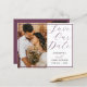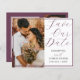 Elegante, salvar o anúncio de data é perfeito para pôr em marcha seus planos de casamento. Apresenta um modelo de fotografia e uma grande tipografia 'salvar a data' em burgundy sobre fundo branco. Personalize com seus próprios detalhes.