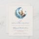 Este belo convite para o chá de fraldas apresenta um doce ursinho-d'água dormindo em uma lua azul crescente decorada com flores azuis, acima das palavras "sobre a lua" em roteiro azul de escrita manual. Personalize o texto com o nome da futura mãe no script e os detalhes na fonte sans serif em um fundo bege. Ideal para o chá de fraldas de um menino.