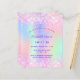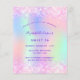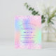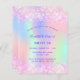Uma menina e feminina Doce 16, 16º convite de aniversário. Na frente: Um arco-íris, fundo holográfico colorido em roxo, rosa, verde-menta, ouro-rosa. Decorado com brilho pinto-claro, brilhos. Personalize e adicione um nome e detalhes da parte. O nome é escrito com um script de estilo manuscrito, letras cor roxa.
