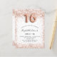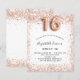 Para um doce elegante 16, 16 anos. Um fundo branco. Decorado com rosa dourado, cintilação falsa rosa, faíscas. Personalize e adicione um nome e detalhes da festa. O nome é escrito com um script de estilo manuscrito, número 16 com fontes de estilo de balão.