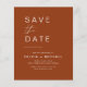 Cartões salve a data Boho Terracotta de Casamento de Orçamento que têm uma foto na frente. Os Cartões salve a data contêm uma moderna tipografia cursiva escrita escrita escrita escrita escrita escrita escrita escrita que é elegante, simples e moderna a ser usada depois da simples celebração do dia de casamento minimalista.
