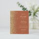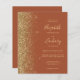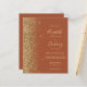 A borda esquerda deste elegante convite de casamento moderno apresenta uma borda falsa de ouro. O texto personalizável combina uma letra pálida de cor dourada, uma letra copperplate e uma letra itálico num fundo de terracota. O verso fornece espaço para detalhes do casamento em um fundo de terracota sólido, junto com um código QR que os convidados podem digitalizar para visitar seu site e RSVP.