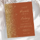 A borda esquerda deste elegante convite de casamento moderno apresenta uma borda falsa de ouro. O texto personalizável combina uma letra pálida de cor dourada, uma letra copperplate e uma letra itálico num fundo de terracota. O verso apresenta um terracotta correspondente e um design dourado.