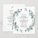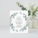 Orçamento Tudo em Um Código QR Eucalyptus Greenery Convite.. Nosso convite de casamento botânico "frente e verso" do barato apresenta uma coroa de galhos de eucalipto de aquarelas em tons verdes poeirentos moldando seu texto de convite personalizado. A parte de trás do convite contém todos os detalhes que você normalmente veria em cartas separadas dentro do pacote de casamento, incluindo o código QR do seu site de casamento — que você pode criar diretamente no modelo de Personalização do Zazzle. Este estilo moderno, tudo num convite de casamento, foi concebido para ser elegante e consciente do orçamento... bem como para poupar tempo. Todos os textos de exemplo em ambos os lados podem ser facilmente revisados com suas próprias informações sobre o modelo de personalização.