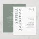 Orçamento Tudo em Um com Detalhes da Tipografia Negra Moderna Sábio Convite de Casamento de Trendy Verdes Monogramas... Nosso convite de casamento verde de sábio "All in One", barato, apresenta uma tipografia ousada de serif combinada com texto sans serif para um convite de casamento simples e monograma de tendências. A parte traseira do convite contém todos os detalhes que você normalmente veria em cartões separados no pacote de casamento, incluindo tempo e local de recepção, opções de acomodação, site de casamento, RSVP e informações de registro. Este convite de casamento ao estilo moderno foi concebido para ser simultaneamente tendencioso e consciente do orçamento... para não mencionar a poupança de tempo. Todo texto de exemplo pode ser facilmente revisado com suas próprias informações sobre o modelo de personalização. Observe que você tem a opção de adquirir envelopes com seus convites ou de obter os seus próprios, se tiver um fornecedor de produtos de papel preferencial.