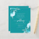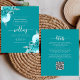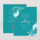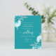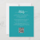 Este convite de casamento elegante apresenta ramos florais turquesa realçados com folhagens prateadas em duas esquinas, sobre um fundo turquesa. O texto personalizável combina fontes prata, serif, itálico e caligrafia. O verso fornece espaço para detalhes do casamento, juntamente com um código QR que os convidados podem escanear para visitar seu site e responder.