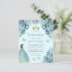Este adorável convite da quinceañera mostra uma fronteira de flores de aquarela turquesa em um fundo de turquesa pálido. Uma tiara de ouro, uma menina de cabelo escuro em um vestido de princesa turquesa e pequenas borboletas turquesas decoram o texto. A palavra "Quinceañera" e o nome do convidado de honra aparecem em um guião elegante de escrita manual turquesa, com o texto remanescente na fonte serif cinza.