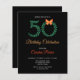 Orçamento elegante verde 50º convite de aniversário. Perfeito para uma comemoração na moda feminina de cinquenta por dia. Possui 5 e 0 dígitos feitos de folhas verdes e borboletas laranja ouro no fundo preto. A parte posterior do convite contém borboletas e iniciais. Você pode personalizar facilmente seu convite usando ferramentas online do Zazzle. Se precisar de ajuda na personalização deste cartão, não hesite em contactar-me através do Zazzle.
