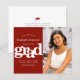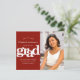 Certifique-se de que todos os seus amigos e parentes poderão celebrar a formatura marcante do seu graduado! Envie este impressionante, simples, moderno e personalizado anúncio de "Salve a Data" com foto, dentro do orçamento, para um evento inesquecível. Uma tipografia branca, em negrito e gráfica sobrepõe um fundo vermelho-tijolo. No lado direito, adicione uma foto de sua escolha. Personalize o texto personalizado com o nome do graduado, ano de formatura e data. Sua mensagem personalizada e um ícone de um chapéu de formatura vermelho adornam a parte de trás. Convites, cartões de agradecimento, enfeites para chapéus, guardanapos, pratos e outros itens de formatura também estão disponíveis nesta coleção moderna e elegante. Garantido para adicionar diversão estilosa à ocasião especial deles!