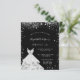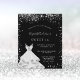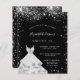 Um convite moderno, elegante e glamoroso para uma festa de Sweet 16, aniversário de 16 anos. Um fundo preto chic com glitter de prata falso e um vestido. O nome é escrito com uma fonte moderna de letra manual. Personalize e adicione os detalhes da sua festa.