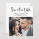 Foto de Script Manuscrito Moderno e Elegante do Orçamento Salve a Ficha de Casamento de Data. O cartão de convite para salvar data inclui uma tipografia de chic e na moda com um design simples e minimalista sobre fundo branco ao qual você pode adicionar sua fotografia personalizada de noivado.