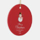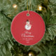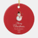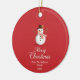 Um cartão-postal festivo com um charmoso boneco de neve vestindo um chapéu marrom e esfregando cachecol em um rico fundo vermelho. Personalize com seu nome de família e ano para uma saudação de Natal quente e eterno.
